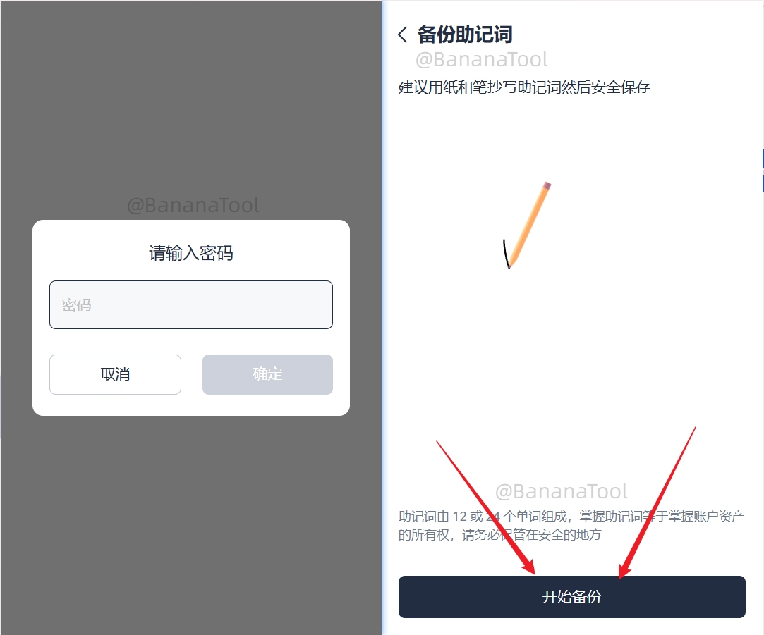 确认密码并开始备份助记词