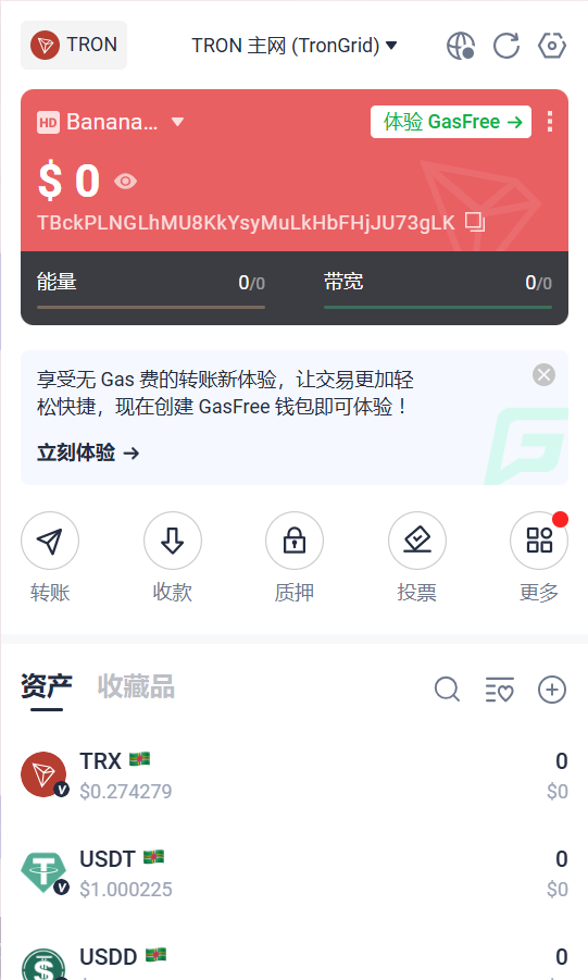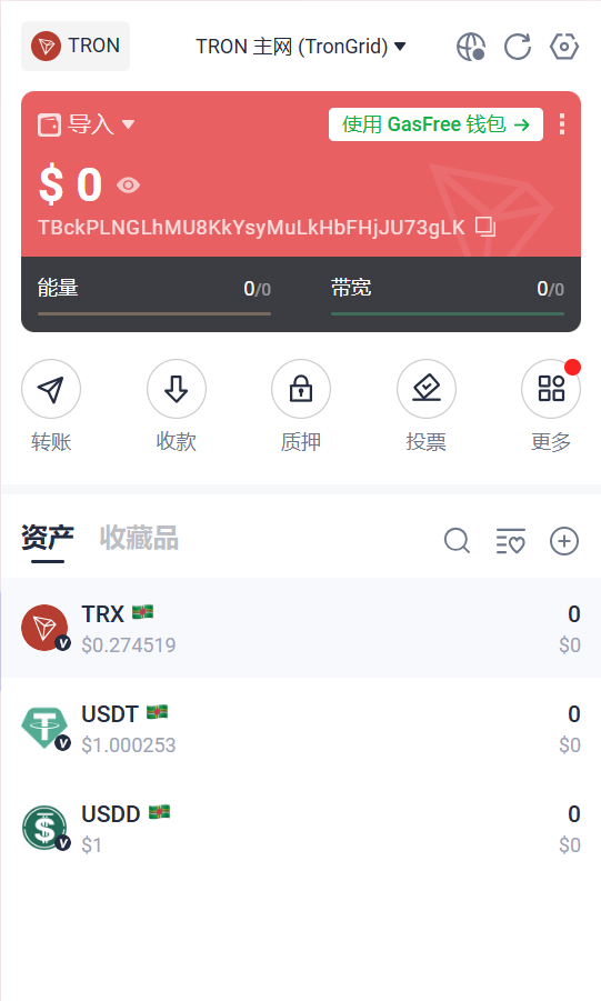 我们这里默认选择TRON波场链即可,之后就算是导入完成了,可以进入到钱包主页了