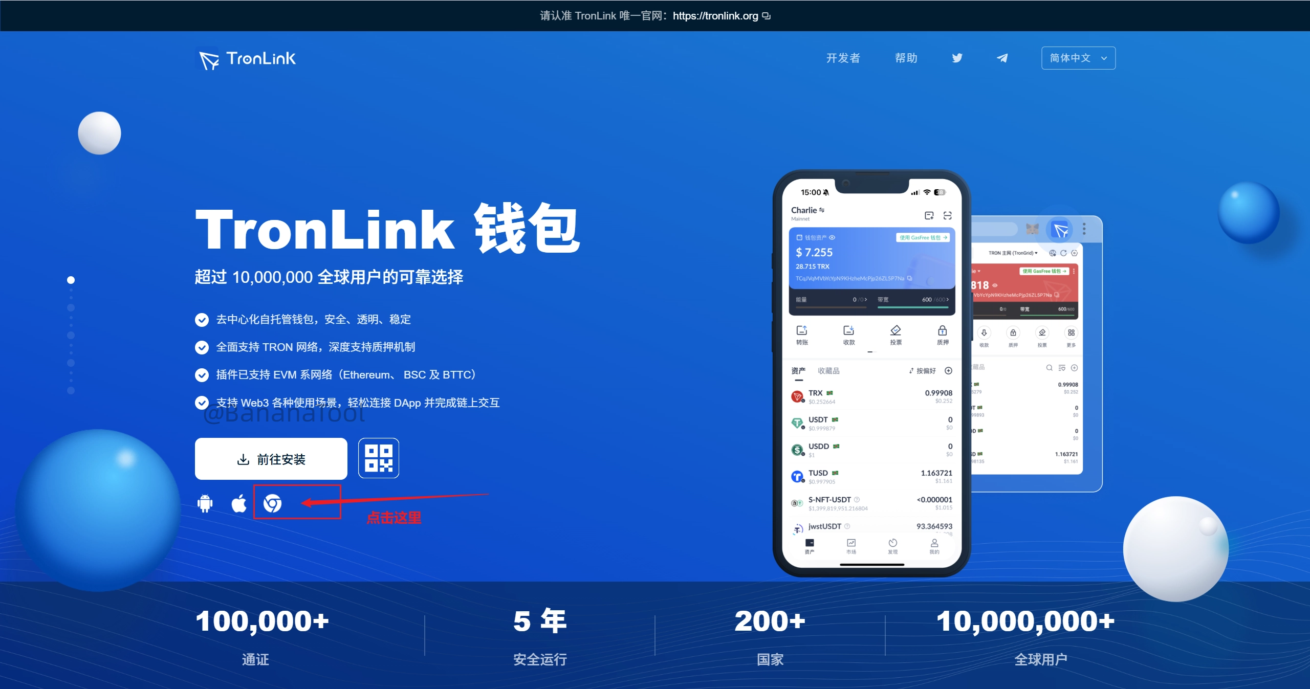 首先,我们进入TronLink的官方网站:https://www.tronlink.org/cn/ ,点击谷歌浏览器图标,会跳转到插件安装地址